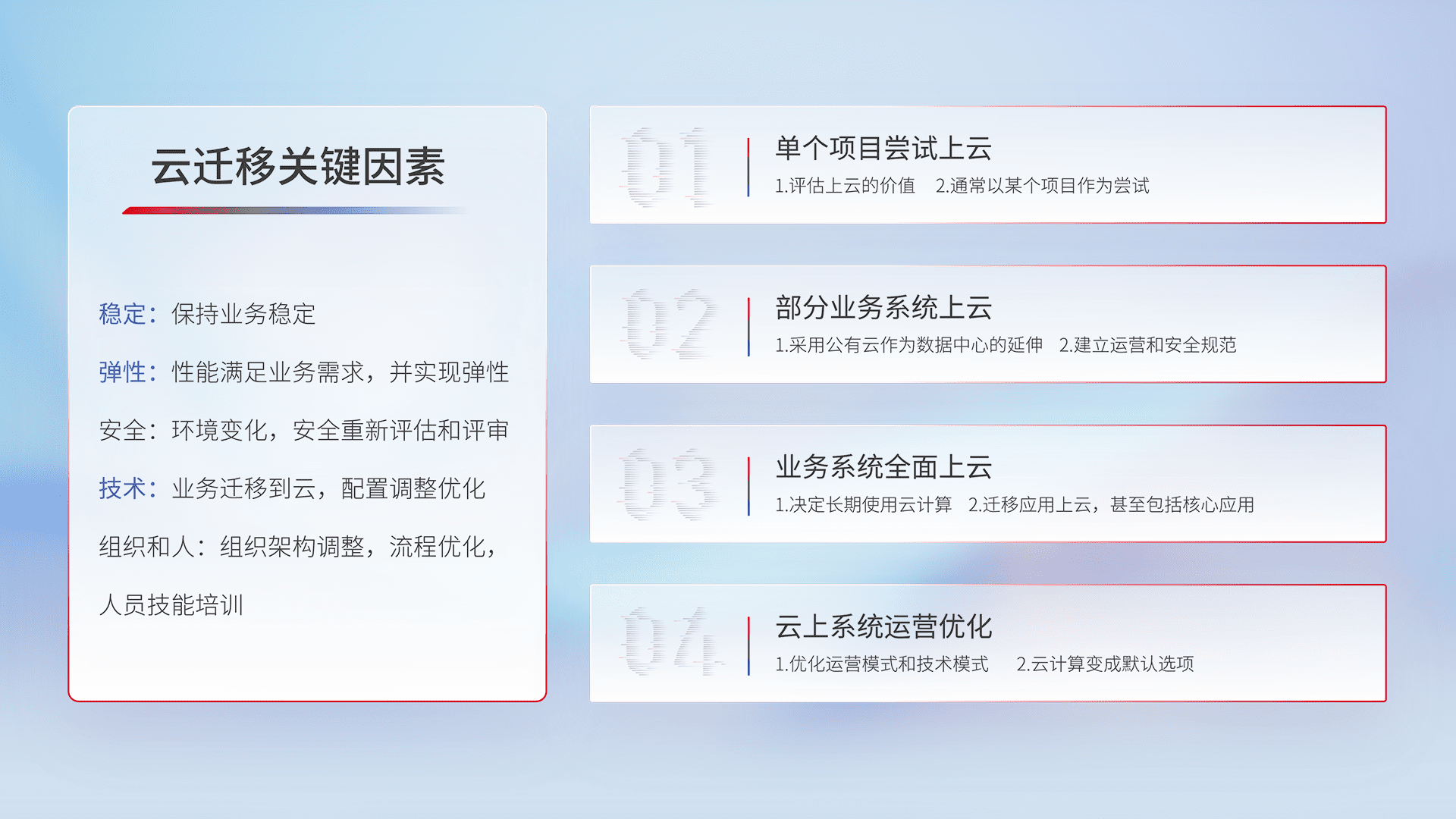 结合实际业务,,,从规划设计、、云平台选型、、云原生改造、、、、数据迁移、、集成交付,,,,迁移全过程为客户识别最佳上云路径,,做好风险识别管理,,,设计网络架构、、身份权限、、、、安全审计合规、、、操作审计、、、日志审计、、监控告警策略、、、多站点容灾设计等,,,对云上基础设施进行整体规划,,,,提升IT治理水平,,以满足弹性、、、、高可用、、、、高性能的需求。。。。