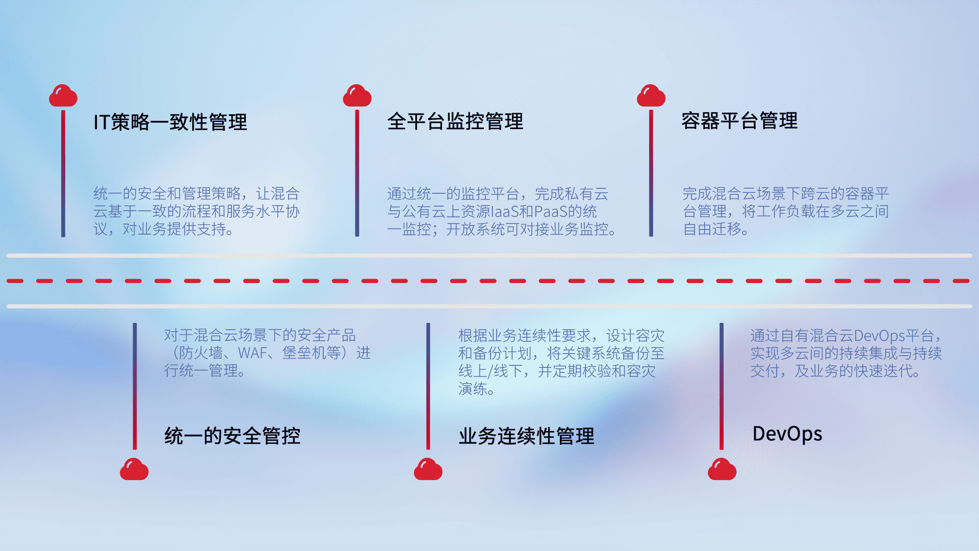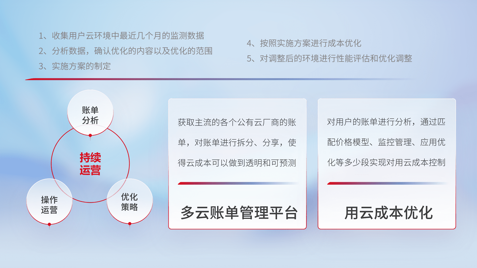 通过多云纳管,,,,以统一的资源数据模型把客户的云资源进行抽象和封装,,,,进而实现对多云资源的统一操作,,保障云资源管理的可靠性、、、稳定性与可用性。。。量身定制化运维内容,,,,配置、、、、开发运维、、、、补丁管理、、、备份、、、、监控、、认证和访问管理、、审计和日常巡检等,,,保障在用云过程中的可靠度,,稳定度以及高可用率。。。