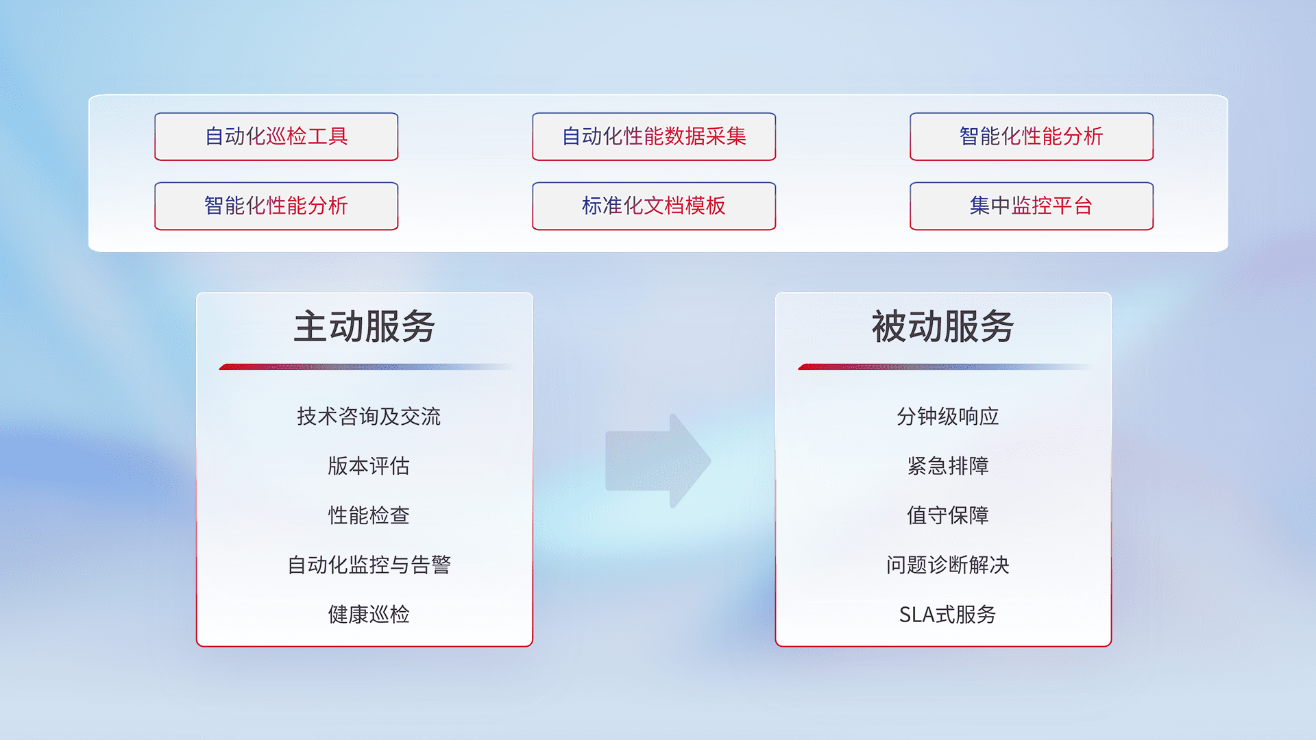 智能化工具和标准化文档,,,保障服务质量,,,,提供主动服务(包含技术咨询、、版本评估、、性能检查、、、、自动化监控与告警、、、健康巡检)和被动服务包含(分钟级响应、、紧急排障、、值守保障、、问题诊断解决、、、、SLA服务)。。