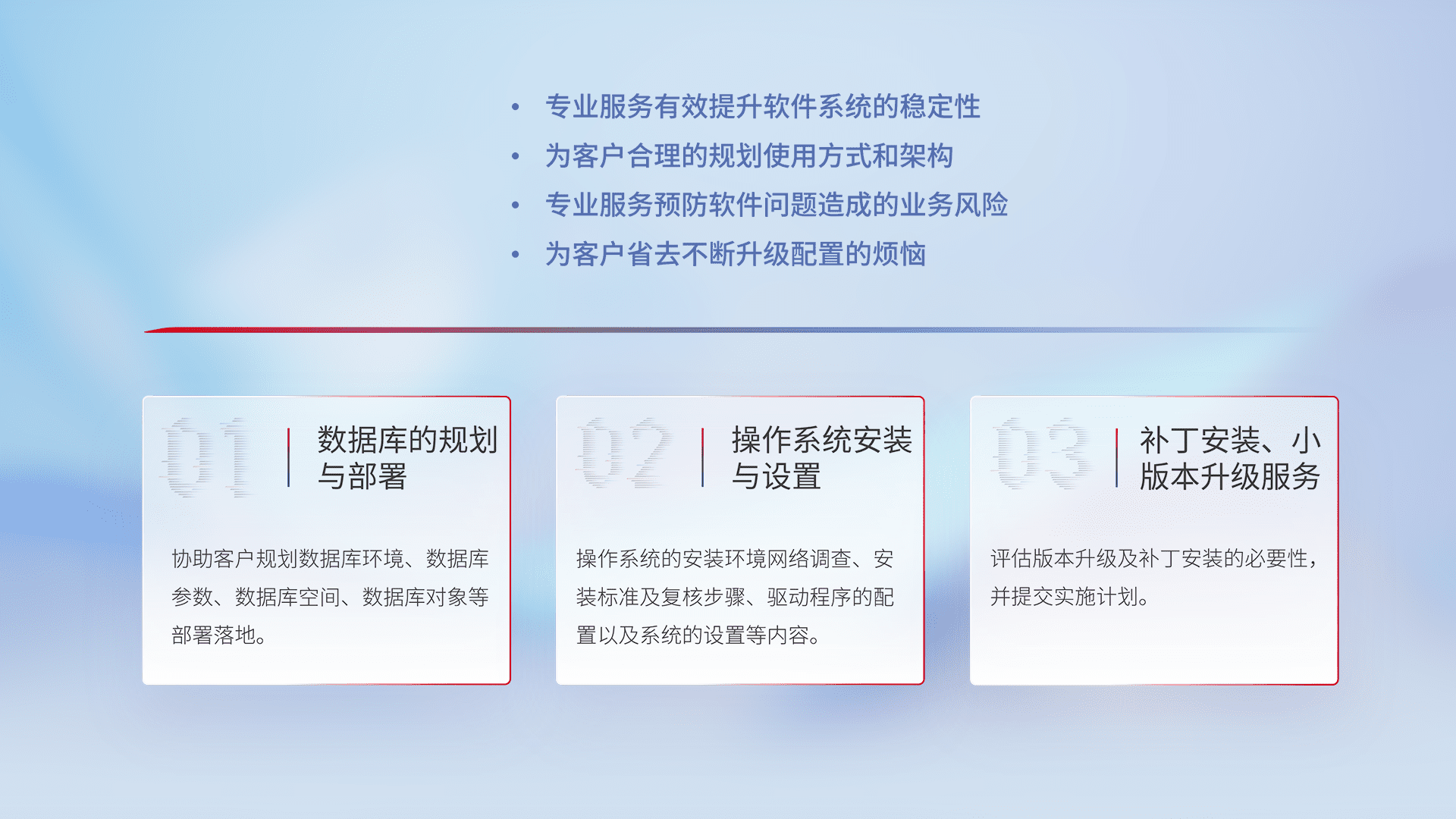 为客户提供软件规模升级、、、、快速部署、、、、按需配置的专业服务,,,,从数据库的规划与部署到操作系统的安装与设置,,,再到补丁安装和小版本升级提供支持。。。
